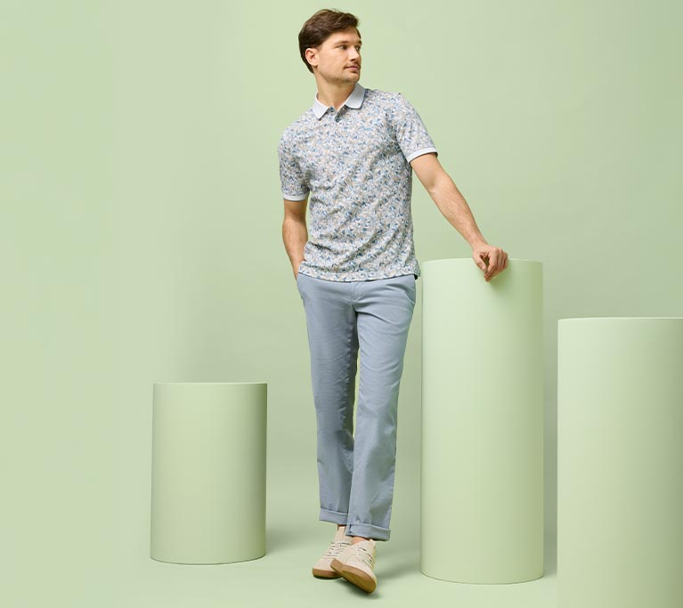 Wenn sommerliche Leichtigkeit auf smarte Flex-Qualitäten trifft, entstehen moderne Looks mit Bewegungsfreiheit. Elastische Qualitäten bringen den Komfort, den Ihr müheloser Sommerlook braucht. Das floral gemusterte Polo setzt einen frischen Akzent und verleiht Ihrem Outfit eine lebendige, stilbewusste Note. Dazu unterstreicht die helle Hose den entspannten Charakter des Looks und sorgt für eine ruhige, sommerliche Klarheit. Ein Ensemble, das unkompliziert wirkt und dabei voller modischer Energie steckt.