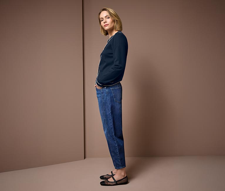 Stepp by Stepp in Richtung Frühling. Modern, vielseitig und perfekt für den Moment zwischen den Jahreszeiten lebt dieser Look von neuen Proportionen. Der cleane Cardigan mit Kontrastnähten wirkt ruhig und reduziert und bildet damit die perfekte Bühne für die moderne Denim-Silhouette. Die Jeans im O-Shape Fit bringt bewusst Volumen ins Spiel: locker geschnitten, weich gerundet, zeitgemäß. Eine Form, die sofort nach Frühling aussieht und sich nach Bewegung, Freiheit und einem stilvollen Neustart anfühlt.