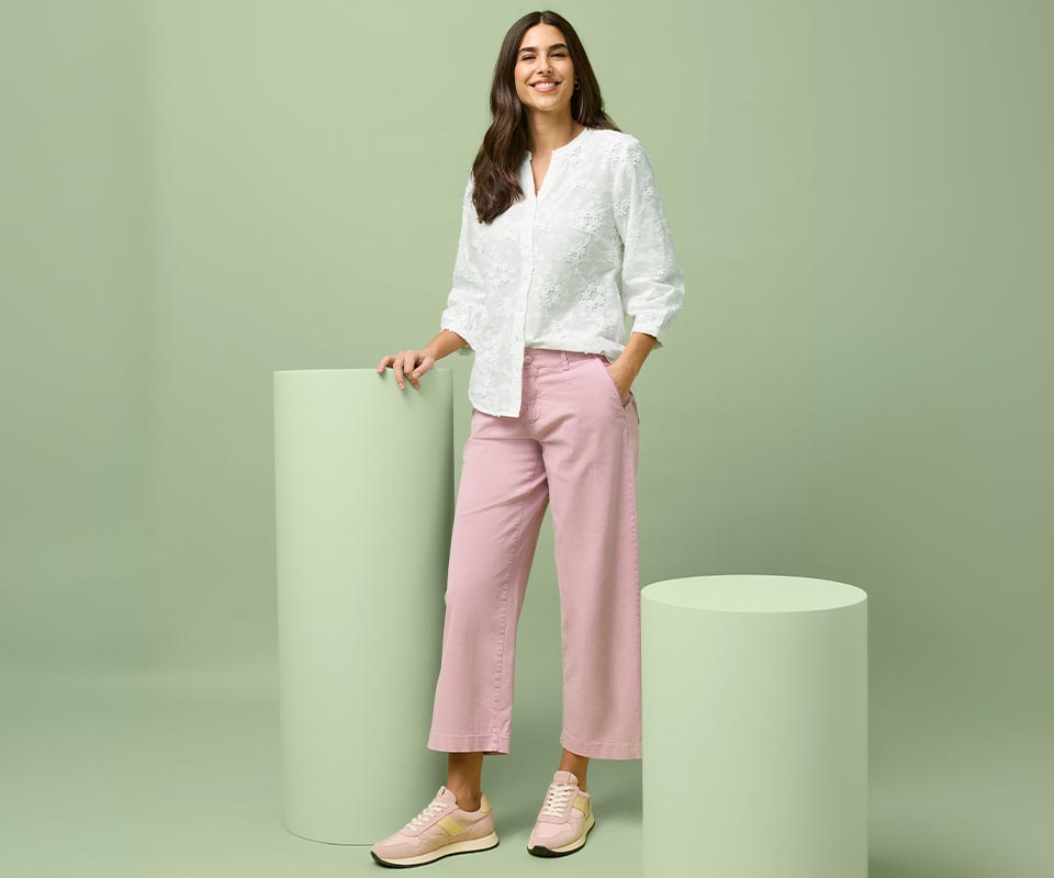 Perfekt für sonnige Tage und alles, was sie mit sich bringen, ist die luftige Embroidery Bluse zur verkürzten Wide-Leg in soften Pastelltönen. Leicht, entspannt und mühelos stilvoll verleihen zarte Pastelltöne eine sanfte Frische. Feine Stickerei-Details, moderne Silhouetten und luftige Stoffe verbinden femininen Charme mit moderner Raffinesse. Dazu setzt die verkürzte Wide-Leg-Hose in soften Rosétönen ein modisches Statement und bringt neue Leichtigkeit in Ihren Alltag. Ein Look, der sommerliche Gelassenheit nicht nur zeigt, sondern spürbar macht.