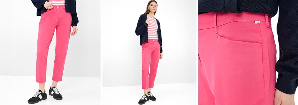 De zomerse modellen zijn gemaakt van fijn katoen, dat ook in de warmere maanden veel draagcomfort biedt. Het stretch-aandeel zorgt bovendien voor veel bewegingsvrijheid en een prettig "tweede-huidgevoel". De luchtige chino-broek voor dames is verkrijgbaar bij BRAX in verschillende kleuren en met verschillende patronen - felle kleuren zijn net zo populair als gedempte tinten en pasteltinten.